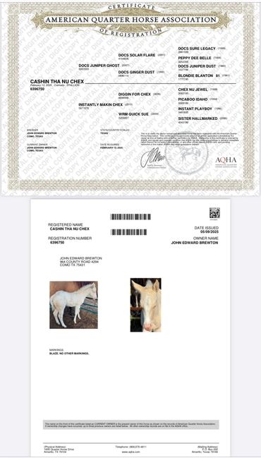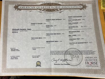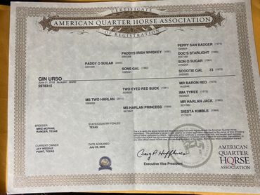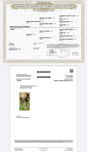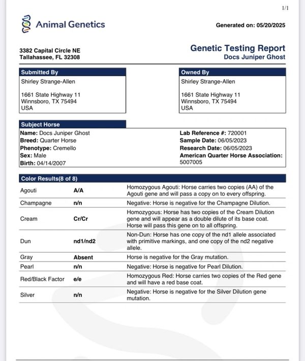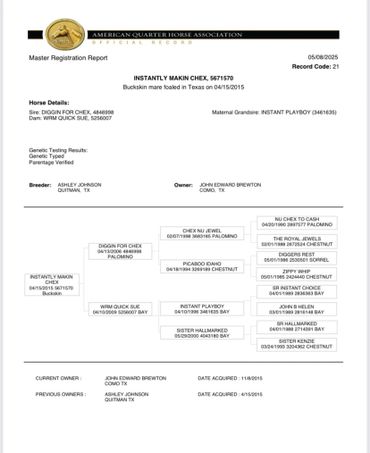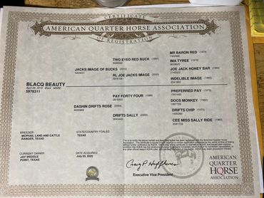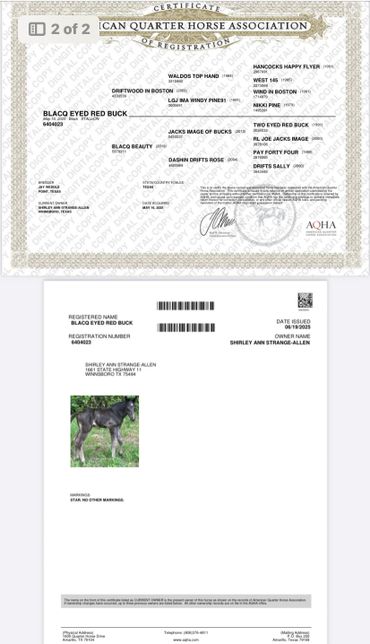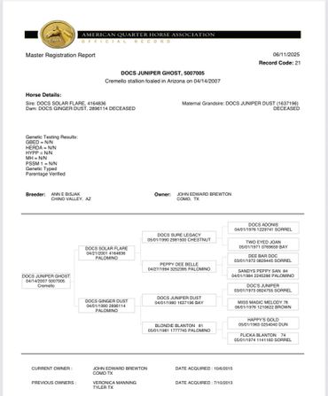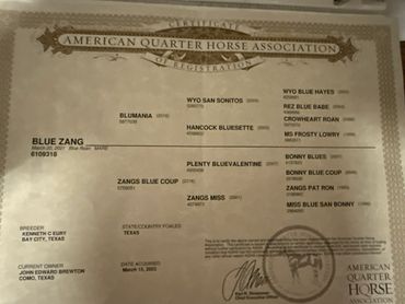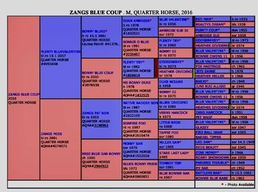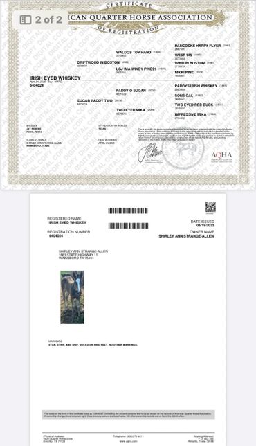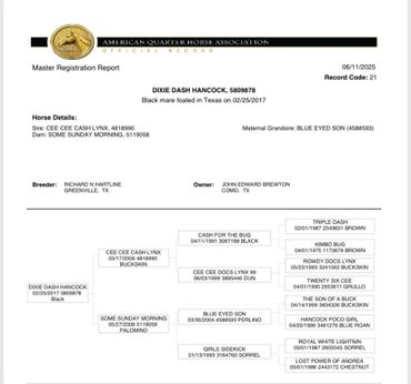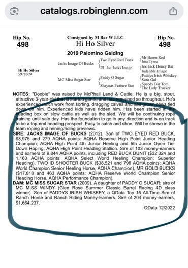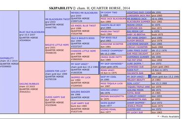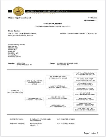 15-2 in height. His pedigree includes Skipper W and Blackburn. His sire is Blue Isle Blackburn, grulla producer of many champions.